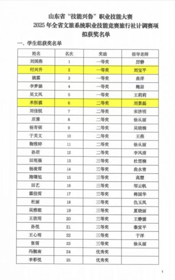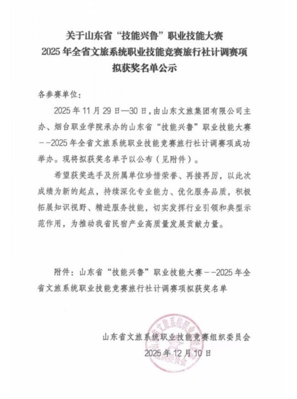 12月11日,山東省“技能興魯”職業(yè)技能大賽旅行社計(jì)調(diào)賽項(xiàng)獲獎(jiǎng)名單正式發(fā)布。由聊城市精品旅游促進(jìn)會(huì)旅行社專委會(huì)會(huì)長(zhǎng)劉寶平帶領(lǐng)的聊職院師生團(tuán)隊(duì),憑借扎實(shí)的專業(yè)功底與出色的實(shí)操能力在賽事中脫穎而出,一舉斬獲多項(xiàng)榮譽(yù)。