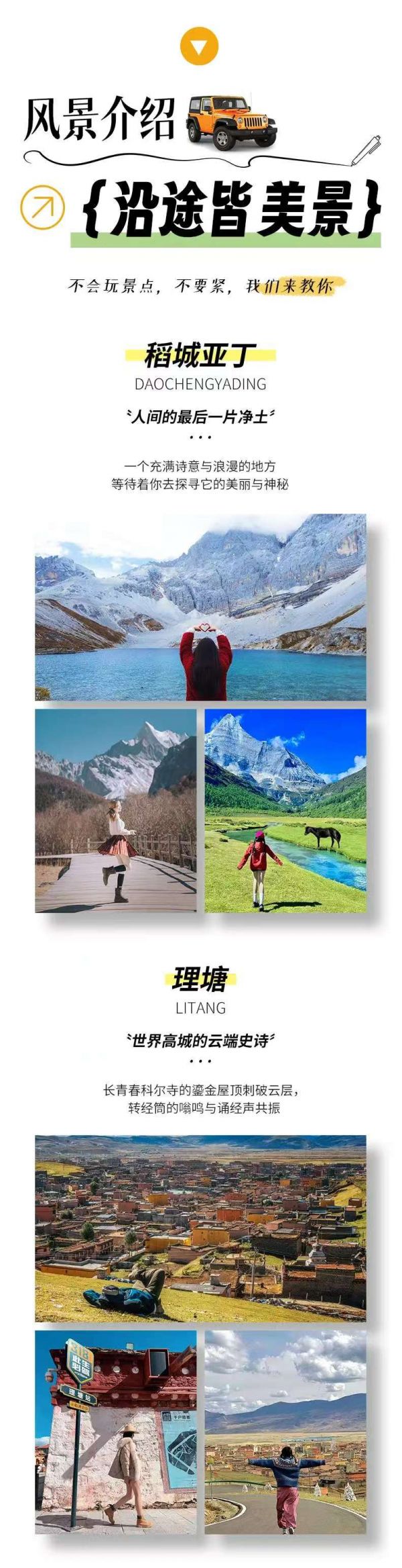 但領(lǐng)隊(duì)進(jìn)景區(qū)拍攝需要同車(chē)一起AA領(lǐng)隊(duì)門(mén)票費(fèi)用,門(mén)票預(yù)估:紅海子清潔費(fèi)15-30元/人;魚(yú)子西/格底拉姆/八郎生都清潔費(fèi)30元/人;稻城亞?。ㄍ緝r(jià)格)門(mén)票+觀(guān)光車(chē)266元/人、(淡季價(jià)格)門(mén)票+觀(guān)光車(chē)240元/人、沖古寺服務(wù)區(qū)至洛絨牛場(chǎng)電瓶車(chē)往返80元/人,單程50元/人(可選擇)、洛絨牛場(chǎng)往返騎馬費(fèi)用300元/人,價(jià)格隨季節(jié)浮動(dòng)(可選擇,不建議乘坐);理塘:套票100元/人。