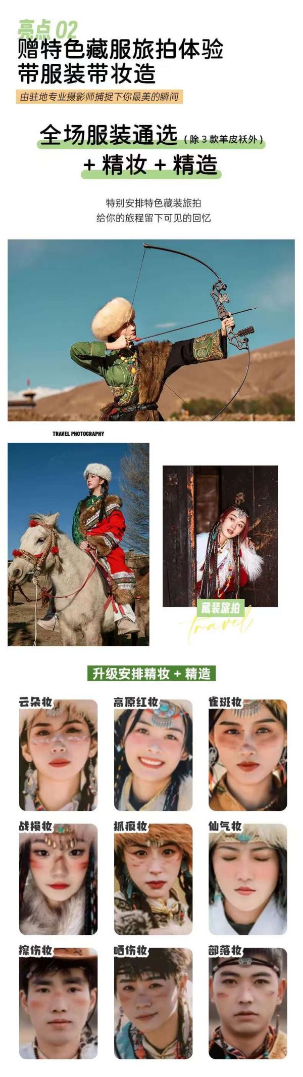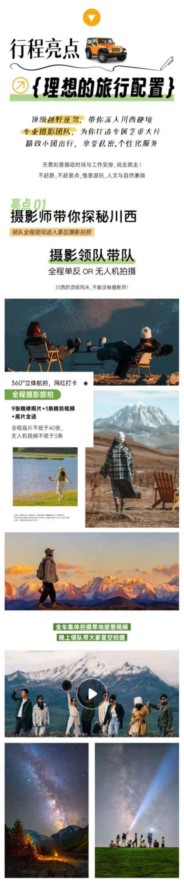 無人機+單反旅拍(底片全送+9張精修照片+1條精剪視頻),底片全程不低于40張,無人機視頻不低于3條(全車人拍攝旱地拔蔥視頻,晚上領(lǐng)隊帶大家星空拍攝);贈送藏服旅拍(6張底片+3張精修),全場衣服通選(除了三款羊皮襖)+精妝+精造;隨車便攜式氧氣瓶每人2瓶、旅行三寶1套/人、撒隆達1份;隨車配備礦泉水、急救包、指尖血氧儀;贈送特色土火鍋+篝火晚會+藏族歌舞表演晚會;可免費提供露營桌椅板凳爐具,可以野餐(食材車上游客一起AA),需提前預(yù)約;體驗藏區(qū)文化特色-畫唐卡;包含80w旅游意外險(不含財產(chǎn)險);包含成都機場接機/市區(qū)接站服務(wù)1次(1-2人安排天府機場拼車接機)。