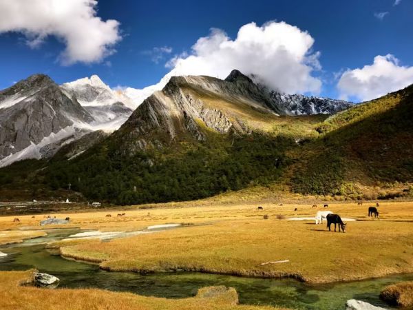 從新都橋出發(fā),可選擇前往甲根壩或姑弄村。早餐后從新都橋出發(fā),前往甲根壩或姑弄村。甲根壩是一個充滿濃郁藏式風情的地方,這里有廣袤的草原、清澈的溪流和錯落有致的藏式民居。您可以在這里欣賞到美麗的田園風光,感受藏族人民的生活方式和文化傳統(tǒng)。姑弄村則是一個寧靜的小村莊,抬頭可見亞拉雪山巍峨聳立,周圍的自然風光十分優(yōu)美。您可以在村里漫步,與當?shù)鼐用窠涣?,了解他們的生活習俗?br />