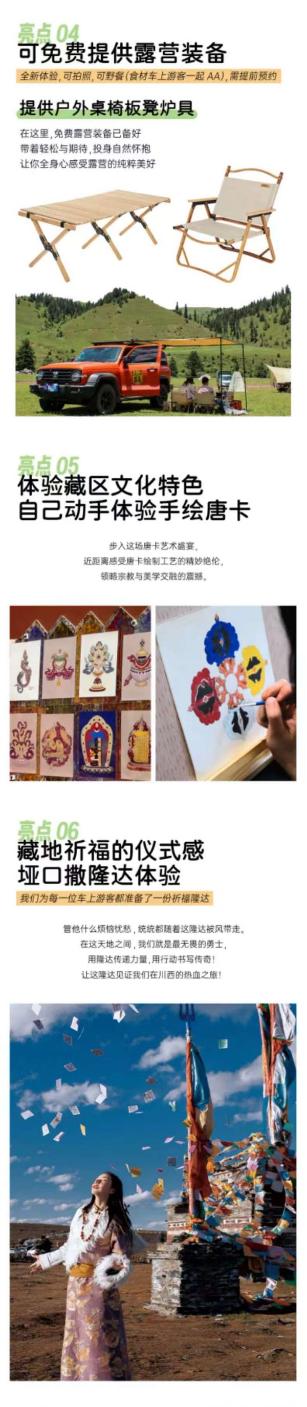 無人機(jī)+單反旅拍(底片全送+9張精修照片+1條精剪視頻),底片全程不低于40張,無人機(jī)視頻不低于3條(全車人拍攝旱地拔蔥視頻,晚上領(lǐng)隊(duì)帶大家星空拍攝);贈(zèng)送藏服旅拍(6張底片+3張精修),全場(chǎng)衣服通選(除了三款羊皮襖)+精妝+精造;隨車便攜式氧氣瓶每人2瓶、旅行三寶1套/人、撒隆達(dá)1份;隨車配備礦泉水、急救包、指尖血氧儀;贈(zèng)送特色土火鍋+篝火晚會(huì)+藏族歌舞表演晚會(huì);可免費(fèi)提供露營(yíng)桌椅板凳爐具,可以野餐(食材車上游客一起AA),需提前預(yù)約;體驗(yàn)藏區(qū)文化特色-畫唐卡;包含80w旅游意外險(xiǎn)(不含財(cái)產(chǎn)險(xiǎn));包含成都機(jī)場(chǎng)接機(jī)/市區(qū)接站服務(wù)1次(1-2人安排天府機(jī)場(chǎng)拼車接機(jī))。