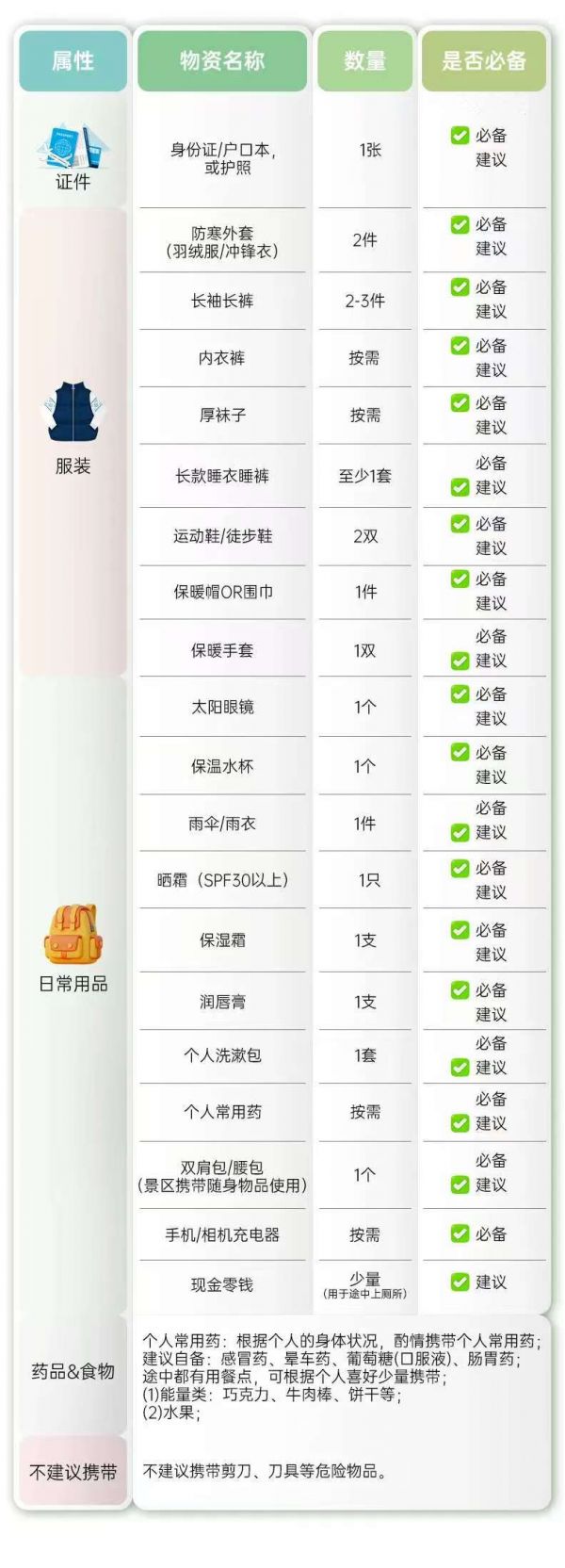 川西高原氣候多變,晝夜溫差大,紫外線強(qiáng),請(qǐng)大家務(wù)必注意防寒與防曬,春夏季節(jié)出行,參考以下物品準(zhǔn)備行李: