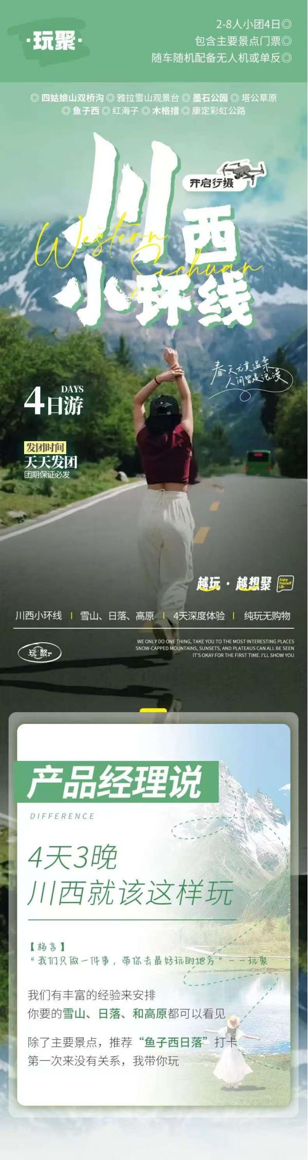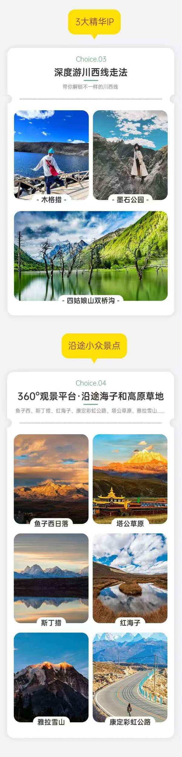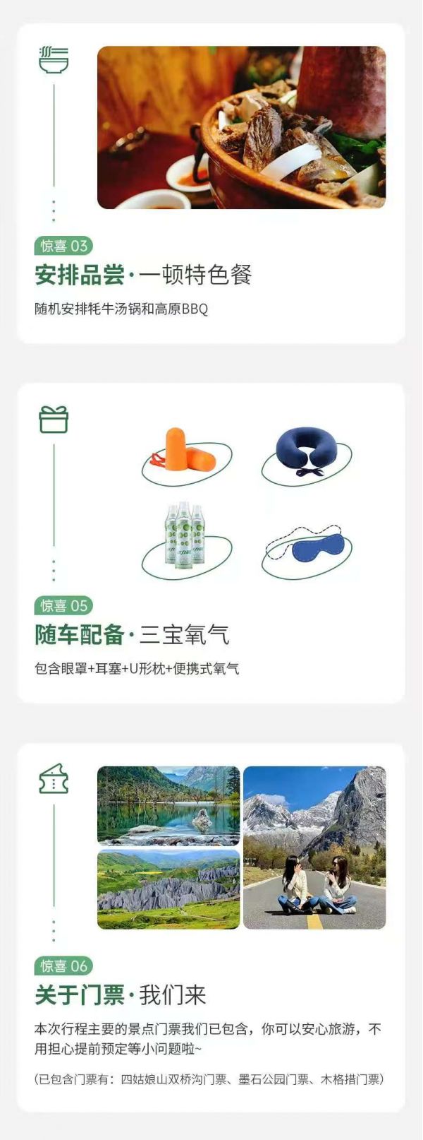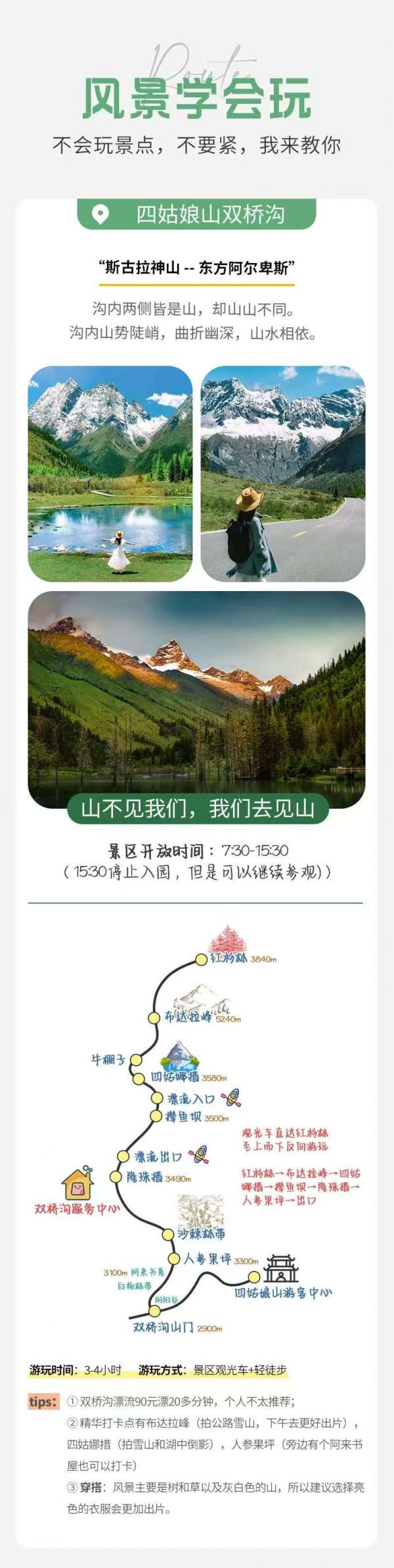 初到高原,建議緩步行走,適應高原氣候,尊重少數(shù)民族風俗習慣。因雙橋溝有限流要求,如遇票滿,我們將更換安排海子溝和長坪溝的門票,以上兩個景點也同屬四姑娘山。