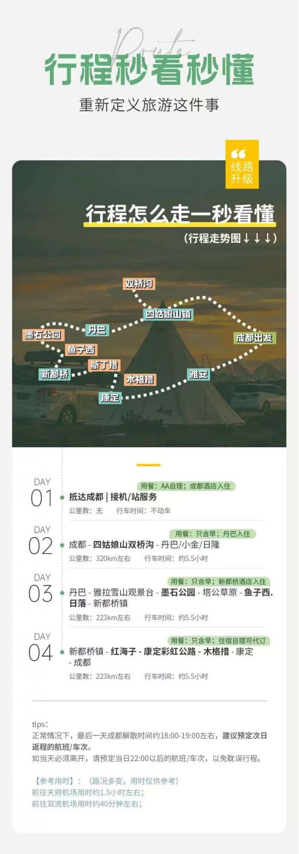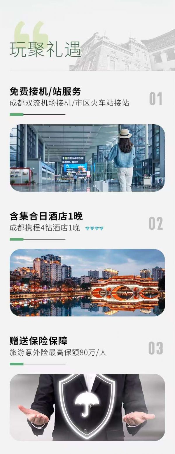 (1)此日不含住宿,如需代定,請?zhí)崆白稍兛头聠危?br /> (2)如果需要當天離開成都,建議訂晚上22:00以后的航班。由于返回路程較長,可能會因為修路、交通管制,堵車耽誤時間,實際到達時間可能更晚,最好是預訂次日返程大交通。