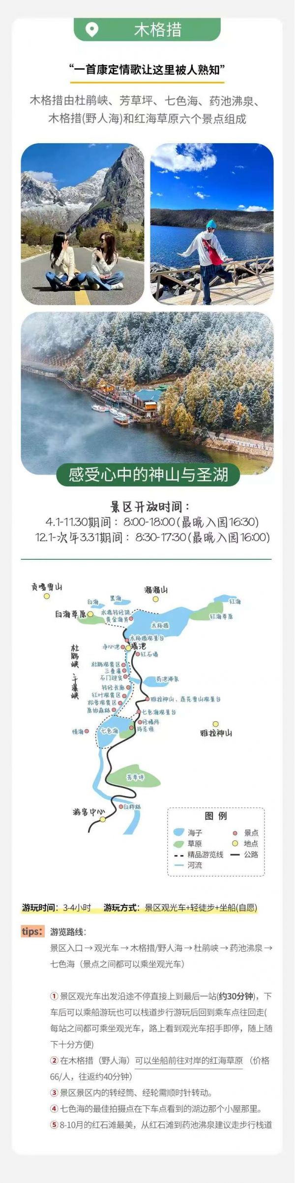 前往木格措景區(qū),大概游玩3-4小時左右,景區(qū)內(nèi)除可觀賞”臥虎觀月”、“石佛鎮(zhèn)?!钡壬骄巴?,在各個季節(jié)的不同時辰還可觀賞到“雙霧墜?!薄ⅰ澳靖裣φ铡?、“木格晨曦”、“木格潮汐”和迭瀑飛泉等云、霞、霧、水奇景,海濱珍珠沙灘可享沙浴、日光浴之樂。