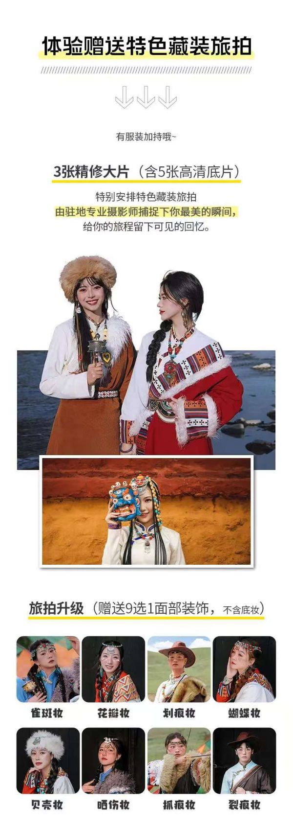 包含體驗特色藏裝旅拍(3張精修照片含5張高清底片),面部裝飾9選1,不含底妝