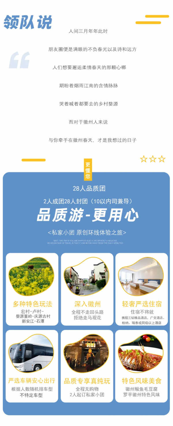 下午徒步蜀源靈山,在養(yǎng)分充足的春天里,漫步花海叢中,感受古老歷史下的小城。約3:00左右結(jié)束行程,返程 預(yù)計(jì)下午16:00抵達(dá)黃山市區(qū),建議購買16:30以后或次日返程票。
