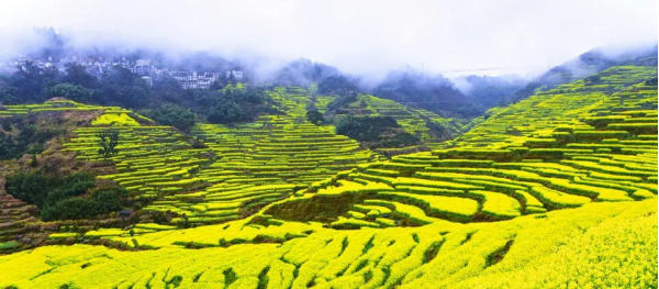 春到篁嶺,周邊千畝梯田簇?fù)?,怒放的油菜花競相爭艷,芳馨誘人,一片黃色的海洋,展示出一幅驚艷的“大地藝術(shù)”美圖。