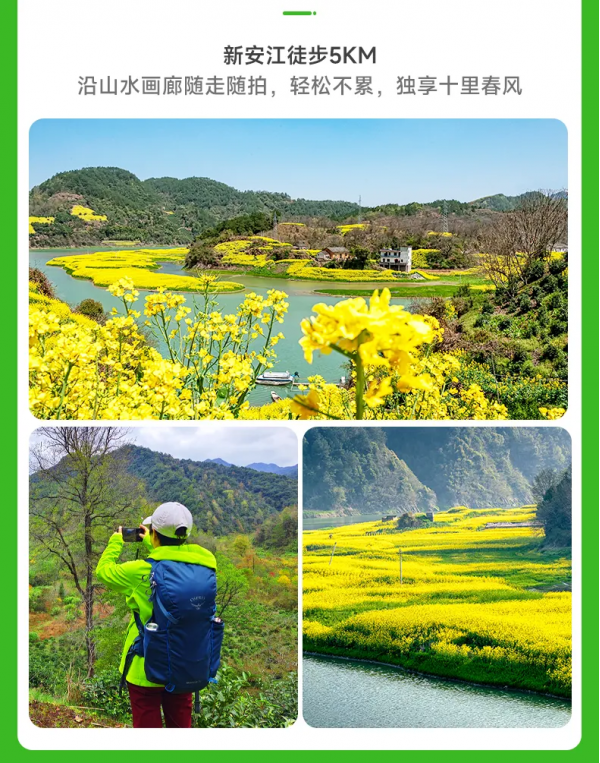 隨后領隊將帶領大家從【石潭】徒步至【新安江】(全程約5Km,難度較低),新安江山水畫廊沿江游步道,清江綠水清幽幽,兩岸青山排垯,金黃的油菜花撲滿岸堤,古老粉墻黛瓦徽派村落散步其中。感受“人行明鏡中,鳥度屏風里”的絕妙意境!
