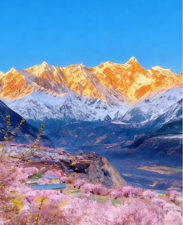 林芝桃花溝 野生桃林綿延30公里,雪山映襯粉色花海
