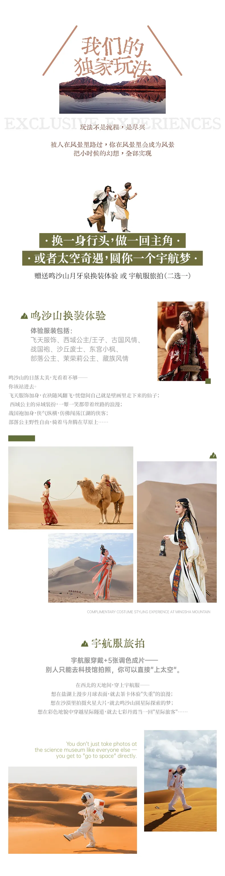 1、贈送換裝體驗或宇航服旅拍(二選一),參考如下: