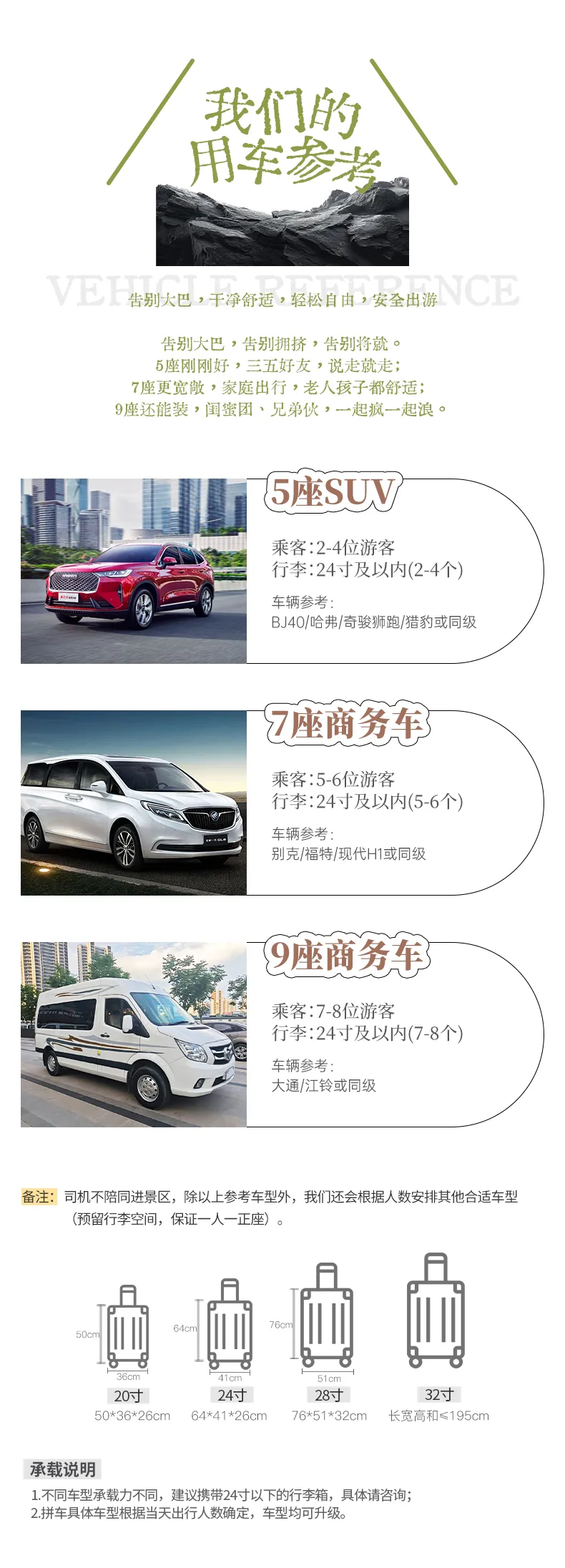 備注:車型承載力有限,攜帶行李為24寸或以下行李箱。