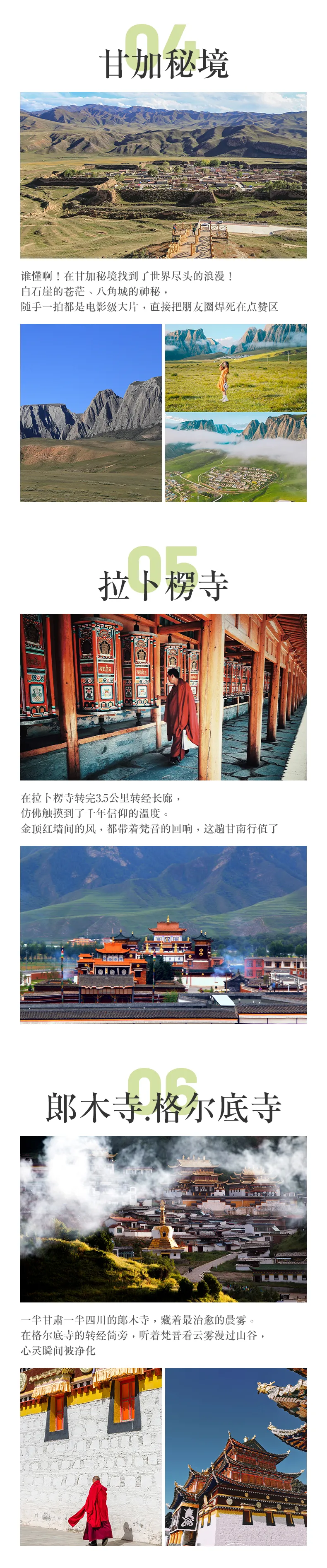 包含甘加秘境門票、拉卜楞寺門票、格爾底寺門票、扎尕那門票、若爾蓋花湖門票、九曲黃河第一灣門票、官鵝溝門票、麥積山門票(含石窟)