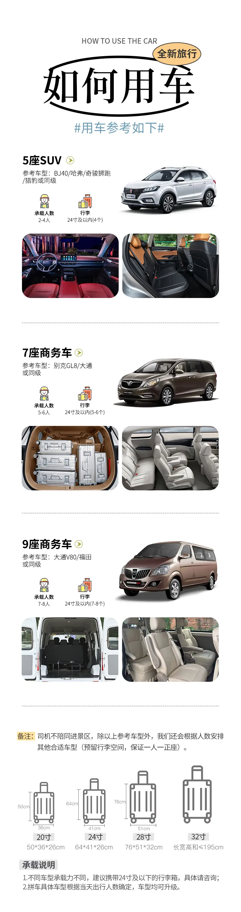 備注:車(chē)型承載力有限,攜帶行李為24寸或以下行李箱。