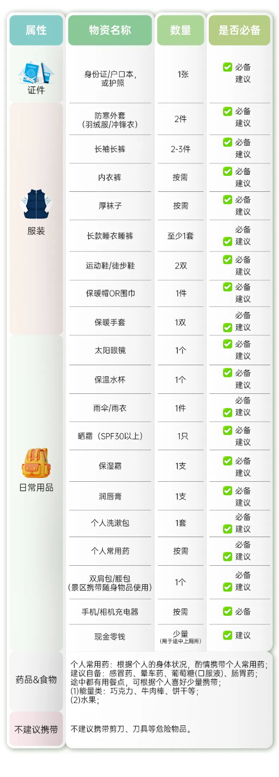 (5)長(zhǎng)途:景點(diǎn)分散,距離較長(zhǎng)。故乘車(chē)時(shí)間長(zhǎng)易疲勞,帶一些零食、飲用水、撲克牌等,途中消遣;