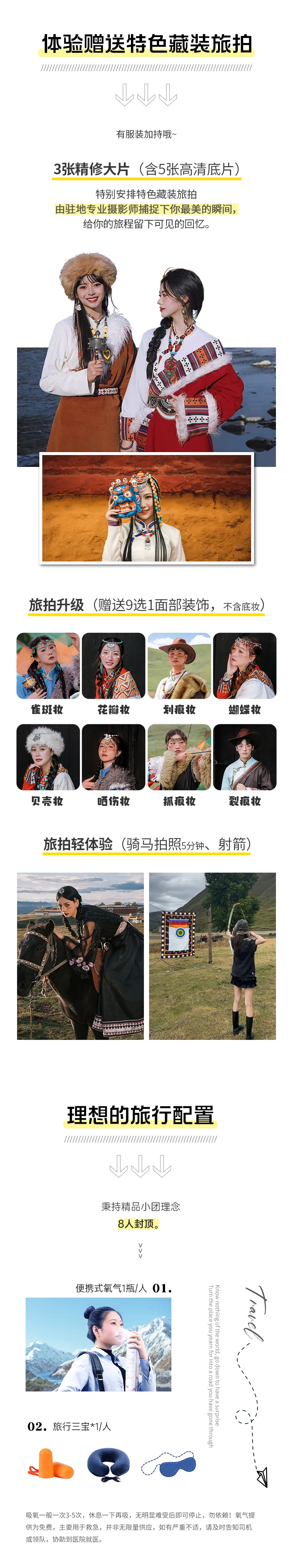 1、包含體驗(yàn)特色藏裝旅拍(3張精修照片含5張高清底片),面部裝飾9選1,不含底妝;