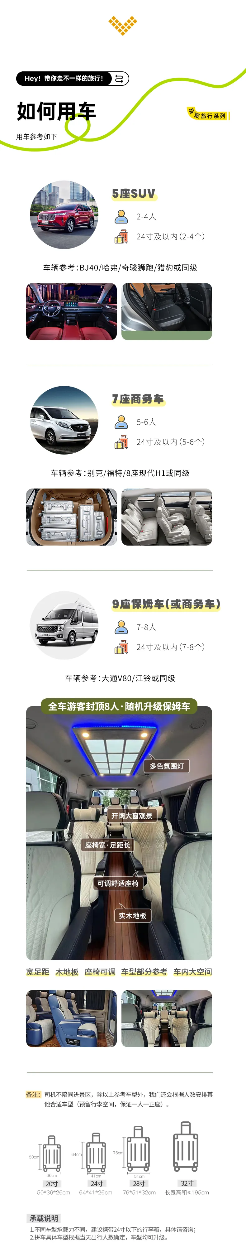 備注:車(chē)型承載力有限,攜帶行李為24寸或以下行李箱。