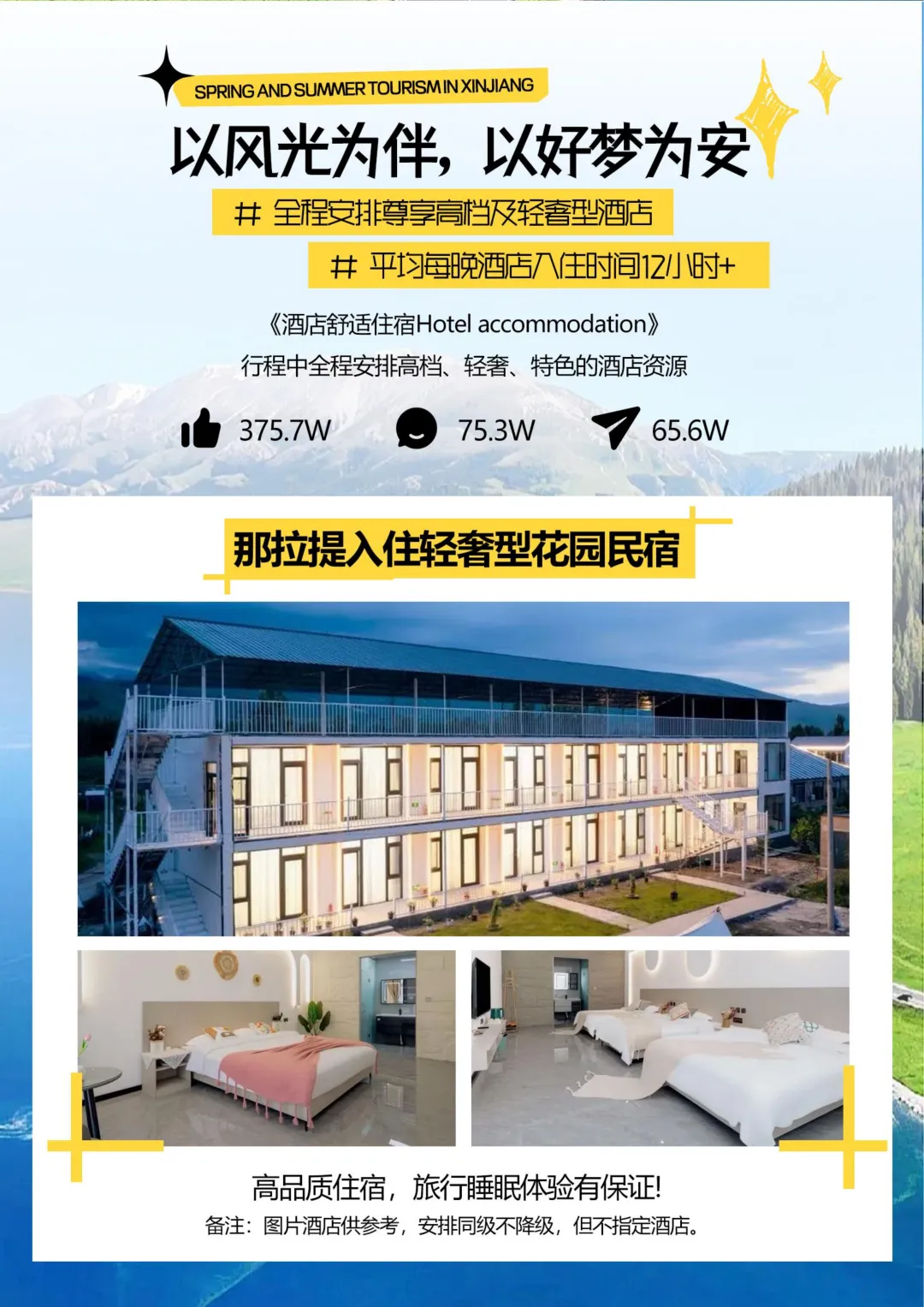 【住宿】全程甄選3晚城市高檔型4鉆酒店+1晚賽湖景區(qū)口輕奢酒店+1晚那拉提輕奢型花園民宿。