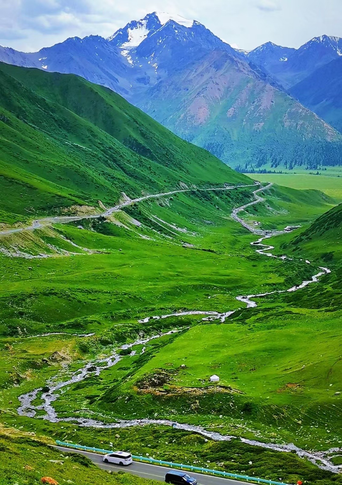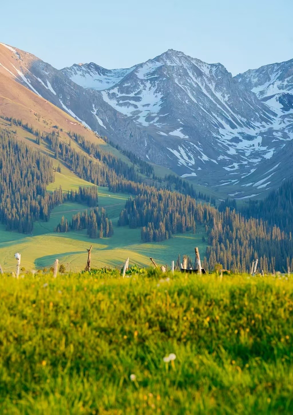 早餐后,告別連綿的草原林海,駛?cè)?strong>獨庫公路北段(僅限7座及以下車輛通行),車輪碾過的每一寸路,都是天山精心鋪就的風(fēng)光畫卷。沿途溪水湍急繞山而行,哈薩克族白氈房散落在路旁,牛羊悠然啃食青草,游牧風(fēng)情撲面而來。行至唐布拉百里畫廊,一眼望不盡的草原如綠毯鋪展,金黃野花肆意盛放,云杉林簇擁著黛藍色遠山,喀什河谷碧水蜿蜒,雪山倒影映于水中,隨手一拍皆是媲美瑞士的風(fēng)光大片。