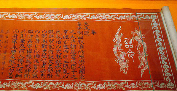 博物館館長劉新華先生介紹,這處“圣旨”博物館為二層仿古建筑,展出面積1000多平方米,館藏明代、清代的詔書、國書、誥封、敕封(通稱為圣旨) 達132道之多,開館展出的“圣旨”55道,以及“偽滿洲國圣旨”和日本、越南、韓國等國家的“圣旨”,并配以明清時期的科舉試題、殿試卷、官場文書、字畫匾牌及用墨魚汁做墨汁密寫在衣衫內(nèi)的“夾帶小抄”等科舉文物2000多件,反映了當時的政治、經(jīng)濟、軍事、外交及中國宮廷文化等多種形態(tài)。