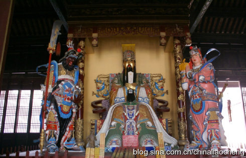 進(jìn)入大殿,便可以看到三尊神像。原有的神像在解放前毀于戰(zhàn)火,現(xiàn)在的神像是1990年還原復(fù)制而成的泥塑像。中間是頭戴十二硫冕,手捧鎮(zhèn)圭,身穿龍袍的關(guān)圣帝君,兩側(cè)分別為周倉和關(guān)平。關(guān)羽生前以忠義聞名,被封為漢壽亭侯漢前將軍。死后被追封為“壯繆”侯。后來的各朝各代的皇帝希望人們學(xué)習(xí)他的忠義為自己的封建統(tǒng)治王權(quán)服務(wù),所以對(duì)關(guān)公的封號(hào)也是非常多的。有對(duì)聯(lián)寫得好“漢封侯,宋封王,明封大帝;儒稱圣,釋稱佛,道稱天尊”。從中我們不難了解,各代王朝、儒、釋、道三界對(duì)關(guān)羽的推崇到了何等高度。所以,這兒關(guān)公神像的皇帝打扮是有歷史依據(jù)的,同時(shí)也表現(xiàn)了山陜商人對(duì)他的崇拜之情。另外,在我們印象中,關(guān)羽是臥蠶眉、丹鳳眼、面如重棗的美髯公,眼前的神像卻為什么是黃臉的呢?這里呢,有一個(gè)傳說故事。