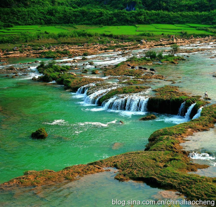 在祖國(guó)邊陲廣西大新縣,有一個(gè)奇特的旅游風(fēng)景區(qū),這就是遠(yuǎn)近聞名的山水畫(huà)廊德天跨國(guó)大瀑布位于廣西大新縣碩龍鄉(xiāng)德天村。大自然竟然情有獨(dú)鐘,將山水神秀盡集于此地,形成了數(shù)百里的天然山水畫(huà)廊。在這百里山水畫(huà)廊中,德天跨國(guó)大瀑布是最最出彩的一幅山水圖畫(huà)。德天跨國(guó)大瀑布位于廣西大新縣碩龍鄉(xiāng)德天村。她橫跨中越兩國(guó),是亞洲第一大、世界第二大的跨國(guó)瀑布德天瀑布,中方瀑布寬120米,與越南境內(nèi)的板約瀑布相連,全寬208米,僅次于著名的位于美國(guó)——加拿大邊境的尼亞加拉大瀑布。瀑布分三級(jí)飛瀉,垂直高度達(dá)60余米,氣勢(shì)磅礴,蔚為壯觀。其年均水流量是我國(guó)著名的黃果樹(shù)瀑布水流量的三倍。
