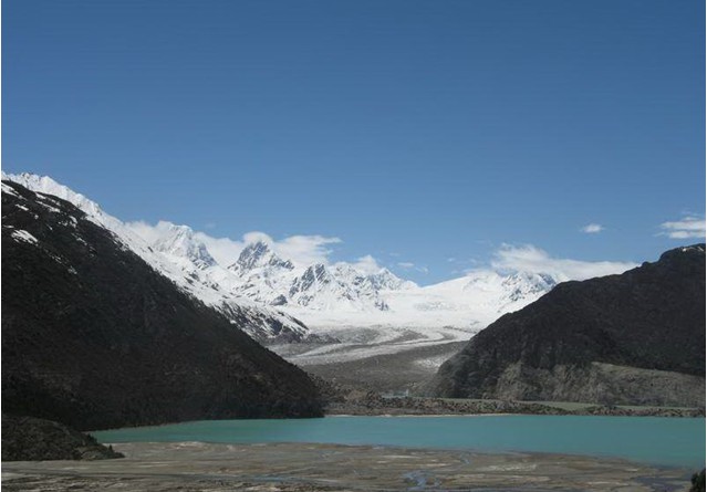 然烏湖北面有著名的拉古冰川,冰川延伸到湖邊。每當冰雪融化時,雪水便注入湖中,使然烏湖經常保有豐富的水源。然烏湖邊是綠草茵茵的草場和綠油油的莊稼;湖邊山腰上則是莽莽的森林,再往上是五顏六色的杜鵑花和灌木叢林帶;山頂則是終年不化、重疊起伏的雪山。