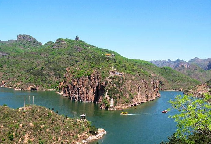 后段為京娘峽,原名三層門。后因此處所傳趙匡胤千里送京娘的故事而改稱現(xiàn)名,左側(cè)山崖上有京娘梳妝臺遺址。這里峭壁高懸,若乘舟入谷,仰望藍天一線,俯視碧水一帶,大有“峰與天關(guān)接,舟從地窟行“之感。