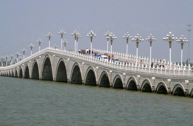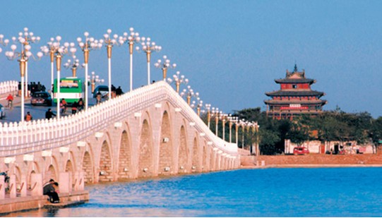 東昌大橋位于聊城古城西首,橫跨東昌湖東西兩岸。2001年6月動(dòng)工修建,2003年落成。古時(shí),人們是由吊橋進(jìn)入古城區(qū),現(xiàn)在連接古城和新城的紐帶就是橫跨在東昌湖上的四座關(guān)橋了。東昌大橋是在原西吊橋的原址部位上修建起來(lái)的,它是我市城區(qū)投資最多,規(guī)模最大的橋梁。東昌大橋全長(zhǎng)322米,橋面凈寬15米。上部結(jié)構(gòu)為石砌拱橋,共21孔,象征著跨入21世紀(jì),所以又稱世紀(jì)拱橋。版權(quán)所有山東聊城聊之旅國(guó)際旅行社有限公司,轉(zhuǎn)載必究!中間5孔為懸鏈線拱,兩側(cè)為圓弧拱。主孔通航凈高9米,可供大型游船順利通過(guò)。拱圈、橋身采用花崗巖嵌面,橋面青石鋪砌,橋上筑有優(yōu)質(zhì)漢白玉攔板266塊,漢白玉欄桿上雕刻著《水滸》人物故事圖案,漫步東昌大橋一個(gè)來(lái)回,就如同看了一遍《水滸傳》。被譽(yù)為“中國(guó)江北最大內(nèi)陸湖泊石拱橋”,堪稱橋梁精品,為美麗的東昌湖增添了一道亮麗的景色。