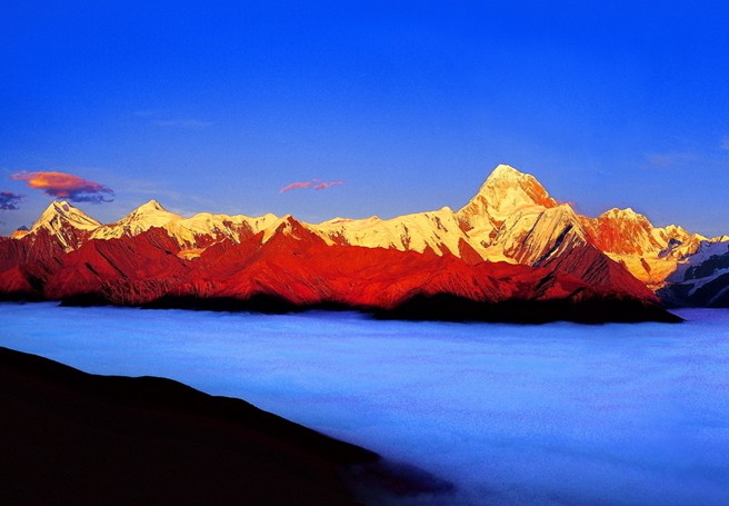 貢嘎山海拔7556米,是四川省最高的山峰,被稱為“蜀山之王”。山區(qū)高峰林立,冰堅雪深,險阻重重,是中國海洋性山地冰川十分發(fā)育的高山之一,在登山運動和科學研究中占有十分重要的地位,是一座極受登山愛好者青睞的名山。