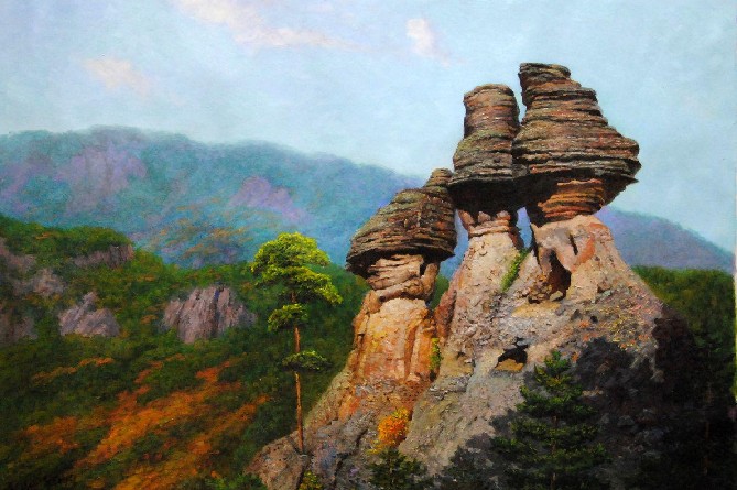 它是約100萬年前(即新生代第3期),從長白山( 朝鮮人稱:白頭山) 的火山脈噴出的熔巖冷卻后凝固而成的流紋巖、玄武巖等火成巖,經(jīng)受了長時期的風(fēng)蝕雨削,形成一座座的山峰,形狀奇異。面積約為250平方公里。