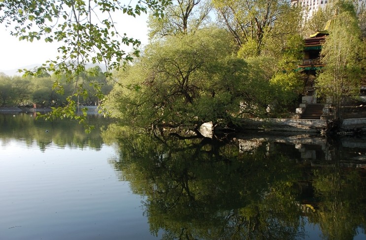 龍王潭(藏語日魯康)是拉薩著名的園林建筑之一。園林中心有一面積較大的潭水,傳說六世達賴倉央嘉措曾從墨竹工卡迎請墨竹賽欽和八龍供奉于北潭水中,所以稱龍王潭。龍王潭初建于六世達賴倉央嘉措時期,但其中潭水坑形成的卻較 早,至五世達賴羅桑嘉措時期修建布達拉白宮和第巴桑結(jié)嘉措所筑布 達拉紅宮及經(jīng)房僧舍時,從山腳大量取土而形成大水潭。