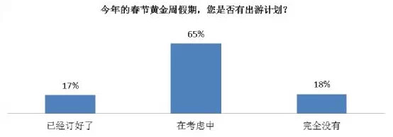 距2015年春節(jié)黃金周假期只有1個(gè)多月了,調(diào)查顯示,有出行意愿的網(wǎng)民達(dá)到八成。17%的網(wǎng)民已經(jīng)訂好了出游計(jì)劃,65%的網(wǎng)民仍在考慮中。18%的客戶(hù)表示沒(méi)有出游計(jì)劃。