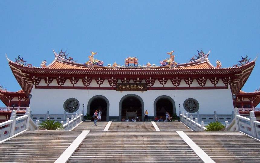 弘仁殿規(guī)模最小,只有3平方米左右,此建筑以山上巖石作后墻,再以花崗石作屋頂及兩邊墻身,殿內(nèi)也供奉天后,兩側(cè)墻身內(nèi)壁有天后之侍女及魔將浮雕,而天后神像則置于山石前,與正殿神龕區(qū)做法一樣,在石屋頂上,此殿也加上綠色琉璃瓦及飛檐式屋脊裝飾。位于最高處的觀音殿,主要由磚石構(gòu)筑而成,其建筑較為簡樸,為硬山式做法。