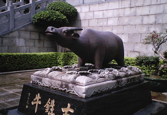 入口是一座聳立的大石牌坊,三門歇山頂建筑,高16米,氣勢恢宏磅礴,正中題“東粵菁華”,兩側(cè)分別書有“金聲”“玉振”,皆是國學(xué)大師饒宗頤先生的手跡。牌坊到正殿是三進石階,院內(nèi)花圃簇擁著石雕的麒麟、青獅、盤龍及鐵牛等吉祥物。