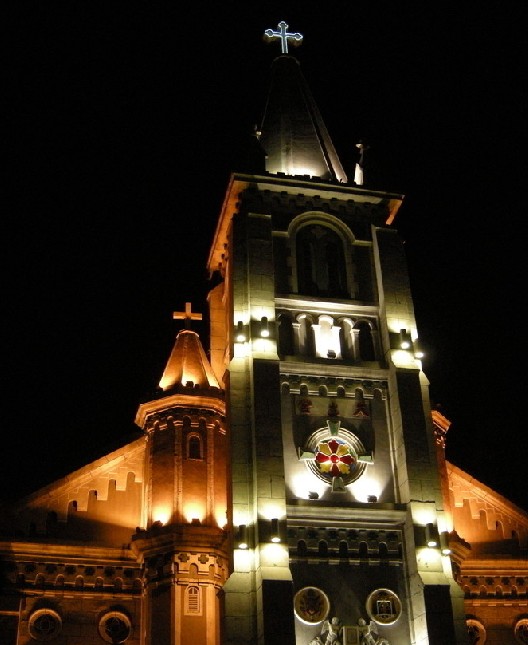 教堂設(shè)有三間大殿,主殿建筑富麗堂皇,給人的感覺肅穆而深沉。在教堂的主殿與堂身之間有一道由實(shí)心磚筑造的拱門。