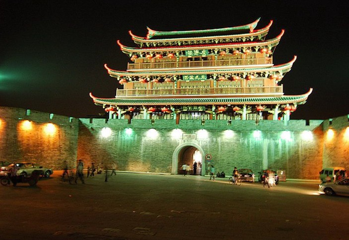 廣濟門城樓是一座宮殿式三層歇山頂閣樓,外城門原有“東為萬春”門額。樓置于高大厚實的臺基上,拱門中開,面闊七間,進深五間,前后面為木石柱相銜接支撐,并跨出城墻外,成為騎樓。城樓為仿宮殿式建筑,重檐歇山頂,配以玻璃瓦紅彤壁,朱柱格子窗,畫棟雕梁,顯得雄偉壯觀。城樓中開拱門,高3.62米,寬2.9米。三樓懸巨型銅鐘1座,鑄于南宋紹興四年(1134)。原置于馬王廟,廟廢,遂移此。廣濟門大江前橫,長橋當戶,扼守閩贛交通要沖。沿廣濟門城樓南北兩側(cè),至今還有2000多米長的古城墻和竹木門、上水門、下水門3座古城樓。暮春三月,登樓眺望,韓江水漲,煙波浩渺,筆峰如畫,行船如梭,別有一番景致,故潮州內(nèi)八景有“東樓觀潮”之勝。