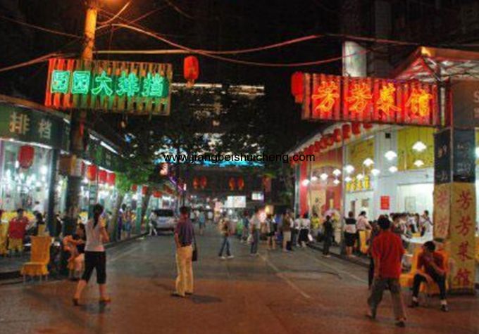 “吉慶街白天不做生意,就跟死的一樣。”池莉在《生活秀》中如此直白描繪。吉慶街在白天就是一條普通、安靜的小街,與近在咫尺、喧囂繁華的中山大道比起來,實在是清冷寂寞、反差強烈。一到晚上,短短170米的小街在霓虹下頓然活了過來。十米寬的小街上,簡易的圓桌板凳連綿排開,賣花的、賣唱的、拉琴的、吃飯的、擦鞋的……你還沒搞清楚這些人是從哪個角落冒出來,而他們已經(jīng)甩開嗓子吆喝著和你做起了生意。轉(zhuǎn)眼間,人潮暗涌,催促著你盡快落座,識趣的老板娘一邊熱情地張羅,一邊和拉琴賣唱的藝人交流眼色,在一幫人的簇?fù)碇忻悦院?,回過神來才發(fā)現(xiàn),自己到底進了“芳芳”、“明明”、“順記”、“園園”、“小妹”、“玲玲”、“歪歪”哪家排檔,猝不及防,只能搖頭一笑。幾百個臺位滿滿當(dāng)當(dāng),燈火映紅了一張張恣意滿足的笑臉,各色菜肴任君選擇,吹拉彈唱的賣藝人隨你召喚。這些飽經(jīng)世事滄桑、混跡于三教九流、游走于龍魚之間的藝人,不僅可以為你演唱各種戲曲、民謠,還善于察言觀色,在你觥籌交錯,酒酣耳熱之際,用最時尚的妙言諧語為你現(xiàn)編現(xiàn)演,一首首流行歌曲和民謠演繹得讓你忍俊不禁、捧腹開懷。據(jù)說,吉慶街的藝人有藝術(shù)院校的學(xué)生,有音樂學(xué)院的教授,還有寫字樓的白領(lǐng)。版權(quán)所有山東聊城聊之旅國際旅行社有限公司,轉(zhuǎn)載必究!午夜十二點,整個氣氛達(dá)到了高潮。對吉慶街來說,夜是白晝,生活理所應(yīng)當(dāng)是從此刻開始的。買賣人不知疲倦地做生意,直至凌晨四點依舊精神抖擻、聲音洪亮,食客們卸下白日里的憋悶,一口氣興奮到深夜,不知歸去。這個不夜城給人的就是一個歡暢和痛快,難怪讓人愛到了骨子里,美得妙不可言。吉慶街沒有安靜的茶莊,沒有高檔的餐廳,市井味道的排檔是擺了一排又一排。席間的食客形形色色,大學(xué)教授、知名作家隱于其中,文藝界、體育界、政治界人士頻繁捧場,各種口音的中國人,不同國籍的外國人更是流連忘返。排檔將這種面對面的消費方式和平民化的表演方式渾然天成地糅合在一起,沒有絲毫地矯揉造作,很是對了。吉慶街,是全國惟一的可以占道經(jīng)營的場所,這可以說是幾經(jīng)取締又重生的吉慶街獨享的特權(quán)了!這就是吉慶街的文化大排檔,它將面對面、開放式的消費方式與隨意性、平民化的表演方式并浸潤在極具地方特色的民風(fēng)民俗之中,構(gòu)成了獨具特色、遠(yuǎn)近聞名的飲食文化超市,吸引著上至白領(lǐng)官員、下至藍(lán)衫小民以及外地游客紛至沓來。 排檔在很多很城市早已消失,但是在大武漢,還是經(jīng)營得風(fēng)生水起。還是漢味作祟,武漢的大熱天,特別是晚飯后,硬逼著人們在家里呆不住。三三兩兩地,男人們打著赤膊,在外干什么呢?坐在竹床邊吃毛豆喝啤酒最爽快。二十世紀(jì)的八、九十年代,一些勤快的嫂子、夫婦、父子從家里抬出竹床放在屋前臨街的路上,竹床上放著涼面、米粉、米飯、雞蛋、涼菜、自己鹵好的牛肉、牛肚、牛筋、肥腸、雞鴨等,旁邊生一個小煤爐,炒點家常菜,支一、兩個小桌小凳,人們就地坐,吃著喝著,“挖地佬殼”的每天都有鈔票進賬,那時,“下崗”一詞還很少聽見,那些有工作的嫂子們靠這種方式賺錢貼補家用。再后來,一撥人又來了,他們干脆租下門面,十幾個、二十幾個平方都能開店,幾張桌面擺到街上,小家小菜的,號稱“靠杯酒”,很符合武漢市民的口味。到九十年代初期,生意再次做大,門面大了,生意的規(guī)模大起來。1933年左右為吉慶街的最高峰時期,形成了以吉慶街為中心,包括鄰近的交易街、瑞祥路、大智路在內(nèi)的大排檔市場。武漢,正邁出十二五規(guī)劃的第一步,作為肩負(fù)城市使命的中堅力量,忽然意識到,對這座城市的熱愛與尊重不該是反復(fù)地修整、一味地改變,直到喪失過去的記憶,遺忘美好的當(dāng)時,而該承擔(dān)地是文明科學(xué)運營城市的同時,讓悠久的漢文化深入建筑、景觀的骨髓,讓它得以傳承、光耀。吉慶民俗文化街正是在滿足武漢人精神飛躍的同時,吸納了上百年老武漢的歷史文化因子,加以創(chuàng)意的聚合、活力的升華,未來它將呈現(xiàn)給武漢人的既是忘不掉的過去,又是更美好的未來,這樣的情節(jié)才會沁透于心。武漢文化底蘊深厚,有"京劇之母"美譽的漢劇,便鼎盛于漢口, 最終與徽劇合流,誕生了國粹京劇?!斑^早戶部巷,宵夜吉慶街”,武漢人素有此說。每當(dāng)夜幕降臨,華燈初上,吉慶街燈火輝煌,人聲鼎沸,各類美味佳肴應(yīng)有盡有,漢味民間表演各具韻味,美食文化和民俗文化在這里交匯,中外來賓和八方游客在這里歡聚。這里已成為領(lǐng)略武漢都市風(fēng)情的窗口。吉慶街位于漢口著名的老字號“豆皮大王”老通城酒樓附近。東起大智路,西至江漢路。別看這條有名的吉慶街夜市大排擋寬不過十幾米,路面凸凹不平,白天冷冷清清,可一到晚上,它的魅力便凸現(xiàn)出來,賣花的、賣唱的、拉琴的、吃飯的、服務(wù)的……幾百個臺位擠得滿滿的,熱鬧非凡,版權(quán)所有山東聊城聊之旅國際旅行社有限公司,轉(zhuǎn)載必究!特別是在午夜12點以后,整個氣氛達(dá)到高潮。這里沒有安靜的茶莊,沒有高檔的餐廳,但是你一不留神就可以從客人里找出大學