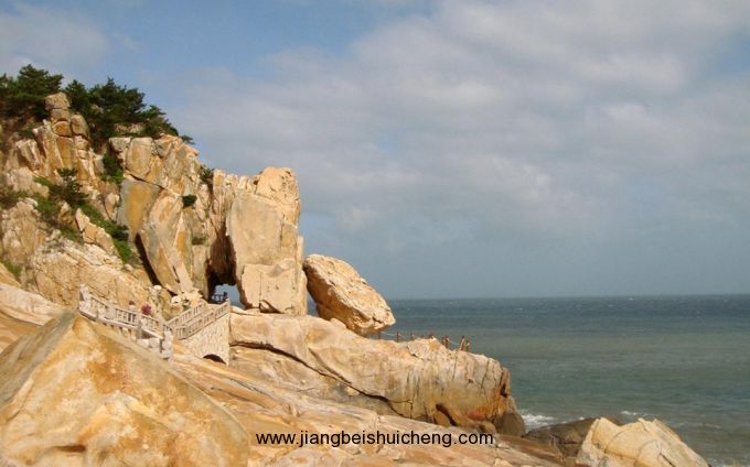 沿著濱海巖石鑿出的一條石徑前行,過了一座石橋,前邊便是“飛戟洞”和“斧劈崖”,幾乎都與媽祖的傳說緊密相連。相傳早年,湄洲灣海域有一條鯉魚多年修煉成精,時(shí)常出沒作祟,為害漁民。百姓苦不堪言,只好求助于媽祖。媽祖勸鯉魚精棄惡從善,改邪歸正。鯉魚精不聽,繼續(xù)一意孤行。媽祖派龍?zhí)忧叭ナ辗}執(zhí)优c鯉魚精交手沒幾個(gè)回合就敗下陣來。媽祖左右將千里眼和順風(fēng)耳看在眼里,急在心里。千里眼揮起斧頭猛力從云中砍下去,鯉魚精沒有傷著,卻把這海巖齊刷刷地切開,成了“斧劈崖”;順風(fēng)耳操起方天戟扎下去,扎出一個(gè)洞,就是“飛戟洞”。龍?zhí)?、千里眼、順風(fēng)耳以三戰(zhàn)一,仍難以取勝。媽祖只好召雷公來助戰(zhàn)。雷公看到“三戰(zhàn)一”斗得正酣,便瞄準(zhǔn)鯉魚精的要害,一錘子打下去,便把鯉魚精打趴在地,成了“鯉魚十八節(jié)”景點(diǎn)。從“霧海尋燈”亭出來,到“讀海臺(tái)”,最后來到“龍洞聽潮”。如果是夏天,這里可是納涼的好地方,即使是炎炎酷日,這里也是清沁涼爽。坐下來歇息,聽海浪輕輕拍打礁石的聲音,令人心曠神怡。順著石階下去,又是一個(gè)人間仙境,仿佛與喧囂的塵世驀然隔絕。抬頭東望,眼前豁然開朗,大海煙波浩淼,一望無垠。如果是秋冬季節(jié),又恰逢滿潮時(shí)分,那狂風(fēng)巨浪拍擊巖的轟鳴聲,那此起彼伏的涌浪瀑出的浪花,激起的泡沫,讓懦弱者膽戰(zhàn)心驚,讓勇敢者激情奔放、壯志滿懷。人們?cè)谶@里都會(huì)充分感受到大自然的神奇莫測(cè),大海的千變?nèi)f化。再高明的藝術(shù)家面對(duì)大海的變幻也會(huì)感到藝術(shù)手段的貧乏和無奈。