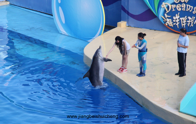 重頭戲——海洋劇場(chǎng)3:30開(kāi)幕。前來(lái)觀看的游客一般會(huì)非常多,盡量提前半小時(shí)去,能坐陽(yáng)光爆曬的座位。節(jié)目?jī)?nèi)容很多,兩只海獅招手、倒立、揮手、拿救生圈救人、對(duì)“落水者”進(jìn)行人工呼吸……不知道與海獅kiss是啥味道。五只海豚則表演游泳比賽、跳高觸球、跨藍(lán)、空中翻身36周半、直立旋轉(zhuǎn)、仰泳等,真的是很有靈性。最讓我驚嘆的是那些團(tuán)體動(dòng)作,竟也能做得那樣整齊劃一,有板有眼。