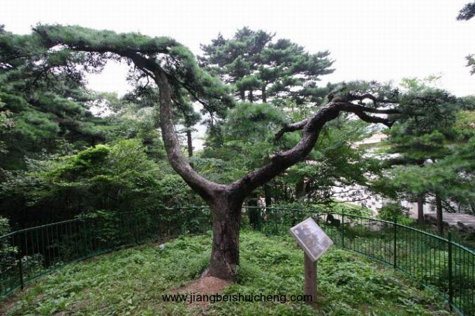 麒麟松位于獅子峰腰,近獅子林精舍。其胸徑50厘米,在樹高l.5米處分作兩干,分別朝東西方向斜展生長,高低錯落。高枝如麟角,低枝似麟尾,主干樹皮如麟甲斑斑,酷似麒麟之態(tài)。故名。今人有詩贊曰:“昂頭翹尾何其神,形同異獸號麒麟。國家昌盛呈祥瑞,預(yù)兆山河萬代春?!?