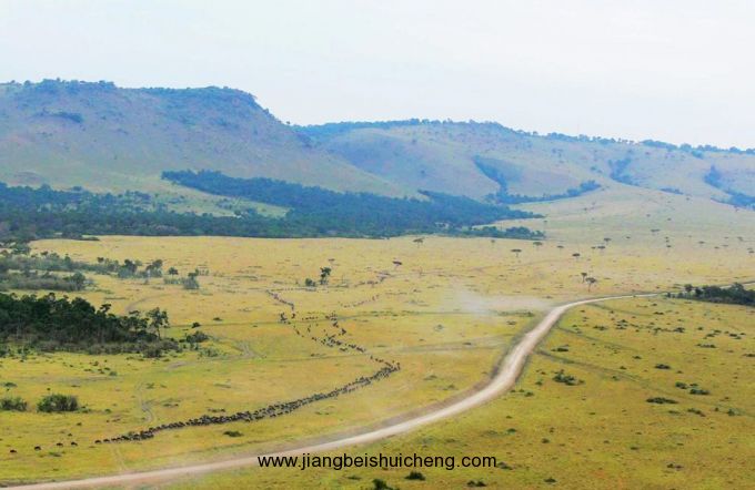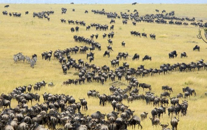 在塞倫蓋蒂草原上發(fā)生的一年一度的動(dòng)物大遷徙是這個(gè)世界上最偉大的自然景觀,動(dòng)物們靠遷徙的方式找尋水源和牧草。從空中俯瞰,遷徙的場(chǎng)面尤為壯觀--每年大約有150萬只牛羚和斑馬會(huì)在塞倫蓋蒂大范圍地巡游一周,它們就像一個(gè)巨大的隆隆作響的割草機(jī)在草原上一掃而過,還給大地的是平均每天450噸的糞便。除了牛羚和斑馬是這個(gè)舞臺(tái)的主角以外,走在這條遷徙路上的還有約30萬只湯姆森瞪羚和3萬只格蘭特瞪羚。不斷壯大的遷徙隊(duì)伍形成了一個(gè)觸目驚心的浩浩蕩蕩的獸群。