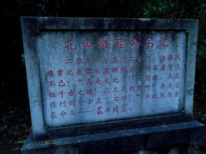 2001年5月20日,江澤民同志來到當(dāng)時的古徽州石窟群視察后欣然為景區(qū)命名、題詞為“花山謎窟”,并連聲感嘆:“真是太絕了!”“是個千古之謎!”“這真是個大寶貝,要是宣傳到國外去,了不得!”
