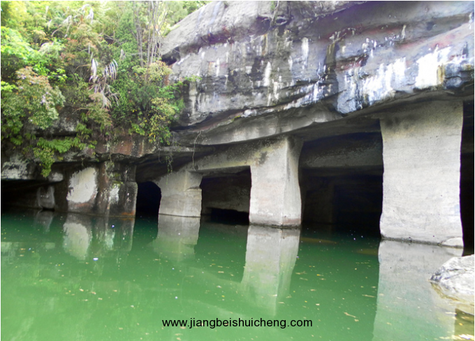 二十四根柱(24號洞)洞門面山路而開,呈扁長方形,寬約50米,高約30米,進(jìn)深莫側(cè),寬綽這大,氣勢恢宏。6根石柱,均是三人合抱的方形大石柱,它們成兩排陣勢支撐窟頂。如此四層,衍入地下,故有“二十四根”之名。洞內(nèi)有水,深不見底。水中有紅、黃、藍(lán)、白、黑游魚,其狀多怪異。