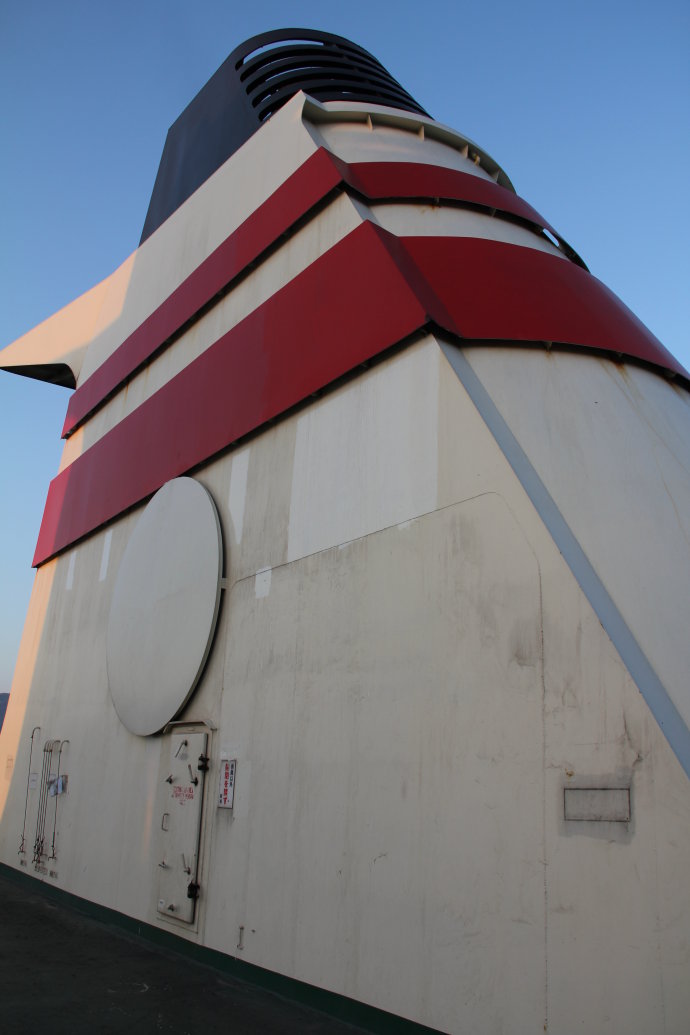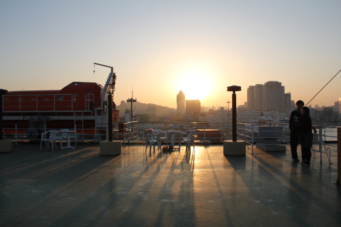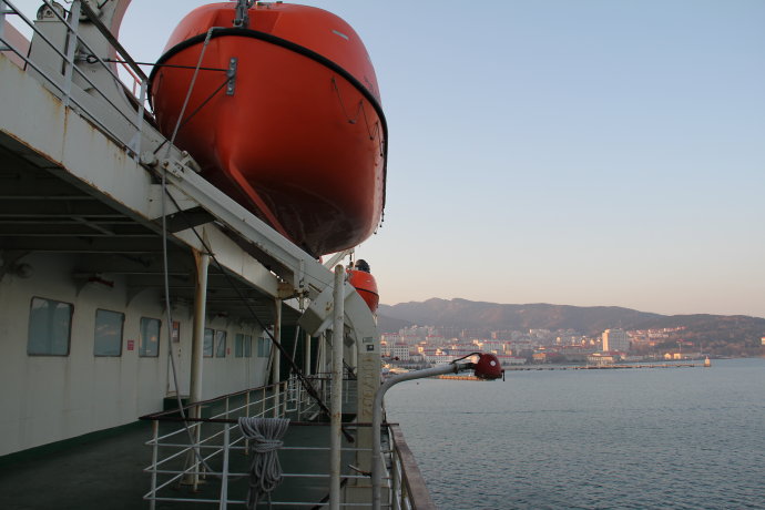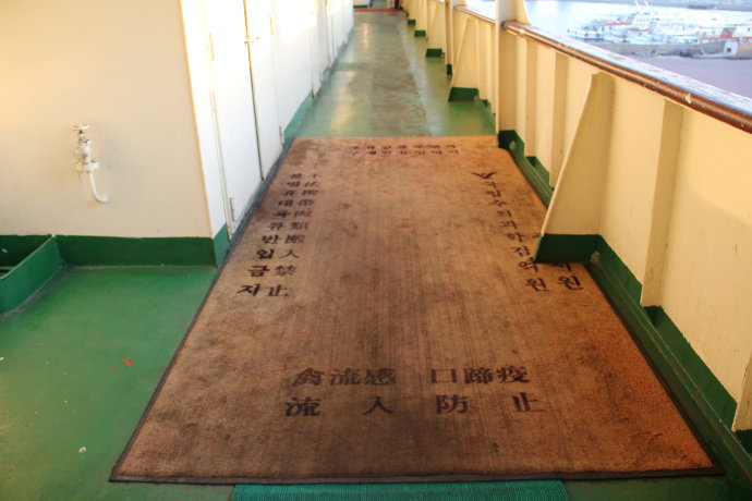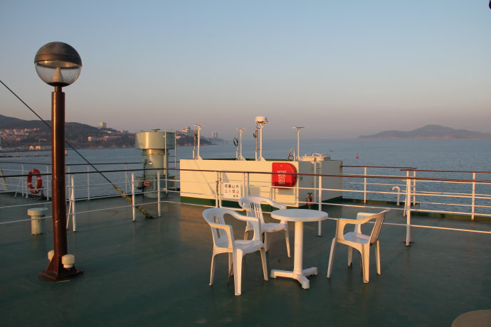 看,這艘船的甲板上,既有提醒游客的熱心性。還為甲板上增添了一道亮麗的風景線,而翻譯成的韓文,就足以說明了威海碼頭的國際性。