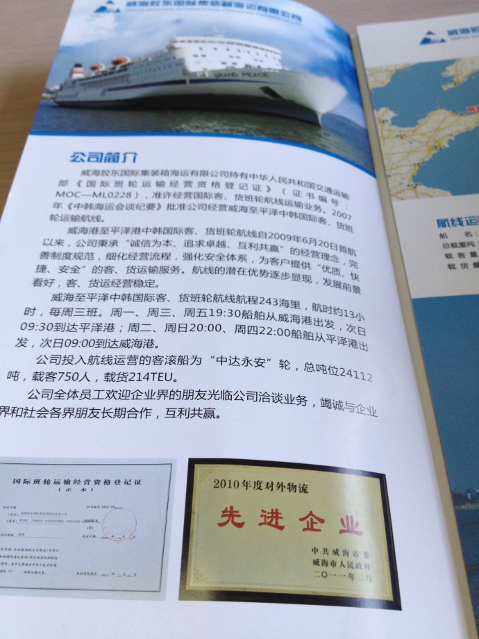 這是威海膠東國際集裝箱海運有限公司的簡介以及他們所獲得獎項,而看到這些也讓我對威海碼頭更加從滿了信任。