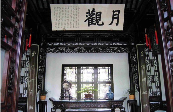 月觀坐西朝東,前臨開闊的湖面,每當皓月東升,憑欄而立,天上水中的兩個月亮交相輝映,我們就能體會到這“月來滿地水,云起一天山”的美妙意境。人們常說“月色如水”,在這里,月光和湖水相溶,云影和山影相連。這副由鄭板橋撰寫的 對聯(lián)恰到好處描繪出了月觀這獨一無二的迷人月夜。