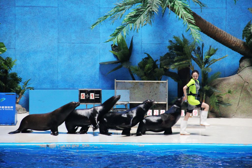 在海洋劇場里有幽默滑稽的海獅表演和浪漫刺激的海豚表演,上演八頭海豚同臺演出、浪漫騎士、激情沖浪、呼啦圈大賽、尾鰭拍球送大禮、高空頂球、人豚共舞、海獅搶凳子、海獅算數(shù)、海獅排球賽、海獅音樂會(huì)、海獅空中360°翻轉(zhuǎn)等令游客歡欣雀躍的精彩表演。