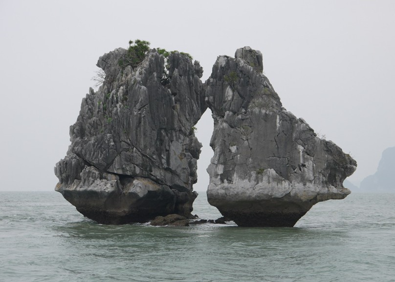 斗雞石是下龍灣海上標致性的景物,兩塊酷似雄雞的溶巖漾在碧波上,惟妙惟肖令人拍手稱絕。