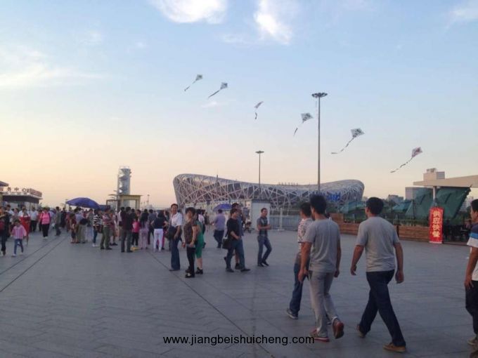 看天空,自由自在的風(fēng)箏在鳥巢上空飛翔